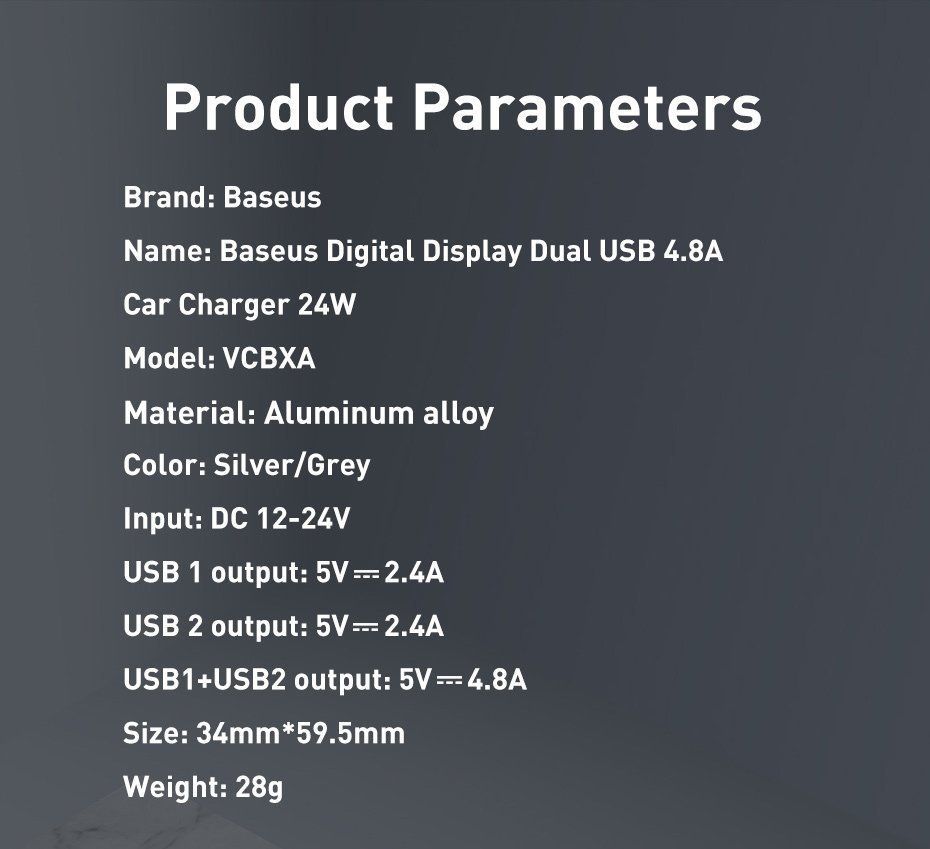 - Smart car charger with charging current/voltage display. A compact gadget equipped with 2 USB ports with a total output current of 24W/4.8A. Perfect for charging the batteries of mobile devices such as smartphones or tablets.