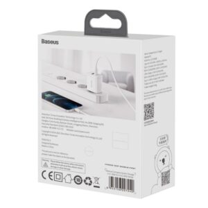 The charger from Baseus will allow you to give up carrying two chargers with you. All thanks to a special project. In the upper part of the plug there are two USB inputs, the first of them is type C, and the second is type A. Thanks to this solution, you can resign from two separate chargers and replace it with one, which is definitely more practical and takes up less space in your purse or backpack. An additional advantage of this solution is the ability to charge two devices at the same time, occupying only one socket.
