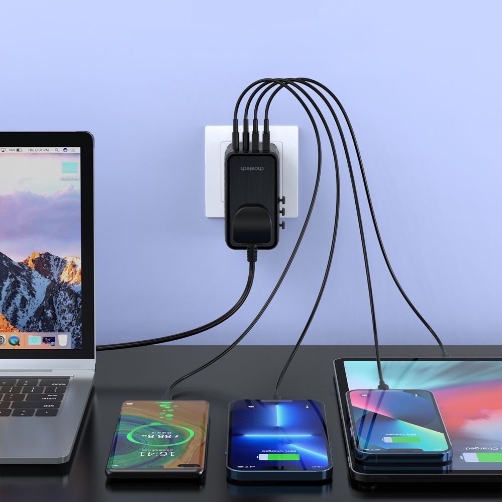 - Charges five devices simultaneously at a fast pace. The adapter has 2 USB-C ports, 2 USB-A ports and one AC socket that support fast charging.