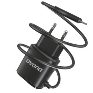 The Dudao A2Pro is a compact wall charger with 2 USB ports and a built-in Lightning cable. This allows you to charge 3 devices at the same time. It was made of high-quality, refractory materials (ABS + PC), extremely resistant to high temperatures and possible falls. It has an intelligent management system that adjusts the voltage to a specific equipment and a number of protections, incl. by overcharging, overheating and short circuits. In addition, a wide range of supply voltage (100 – 240V), thanks to which you can safely use the adapter around the world.