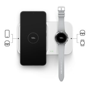 - It allows you to charge two devices at the same time . You can use it to charge any smartphone with inductive charging, Samsung Galaxy Buds headphones and the Samsung Galaxy Watch.