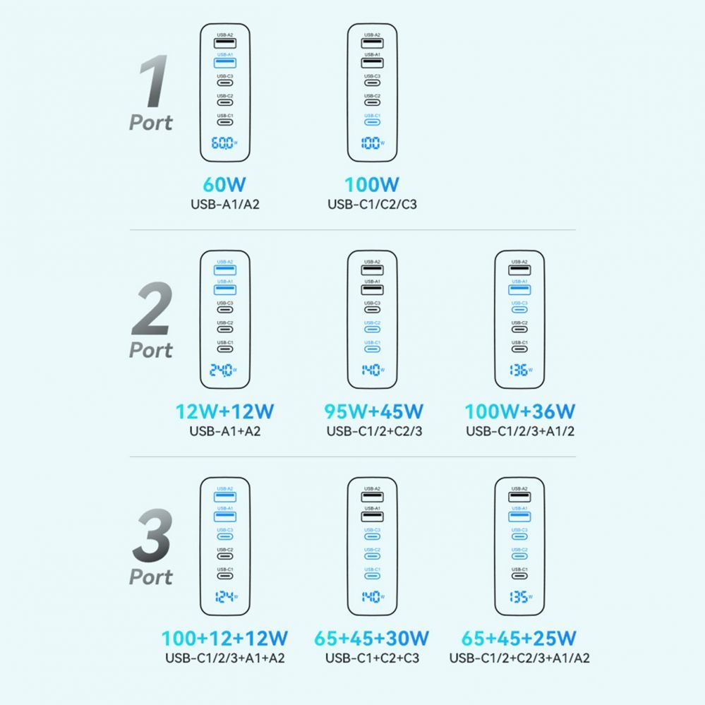 - USB-C 1 / USB-C 2 / USB-C 3 + USB-A 1 + USB-A 2: 100W + 12W + 12W