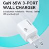 - It allows you to charge multiple devices simultaneously. It has three ports: two USB-C and one USB-A.