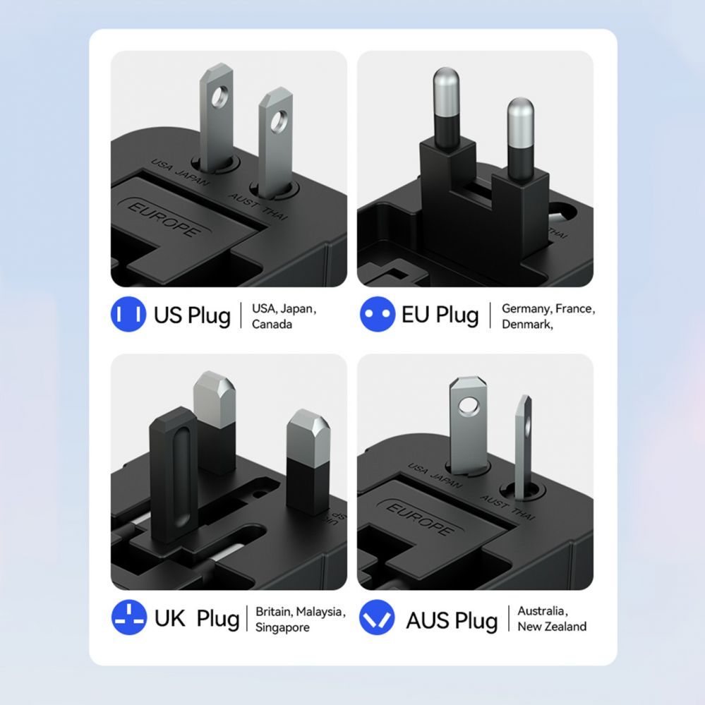 - It allows you to use electronics in over 150 countries. The adapter supports power standards from US, AUS, UK and EU.