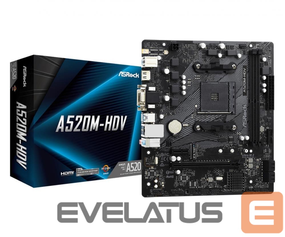 AMD protsessori emaplaat Asrock Mainboard||AMD A520|SAM4|MicroATX|1xPCI-Express 3.0 1x|1xPCI-Express 3.0 16x|1xM.2|Memory DDR4|Memory slots 2|1x15pin D-sub|1xDVI|1xHDMI|2xAudio-In|1xAudio-Out|2xUSB 2.0|4xUSB 3.2|1xPS/2|1xRJ45|A520M-HDV