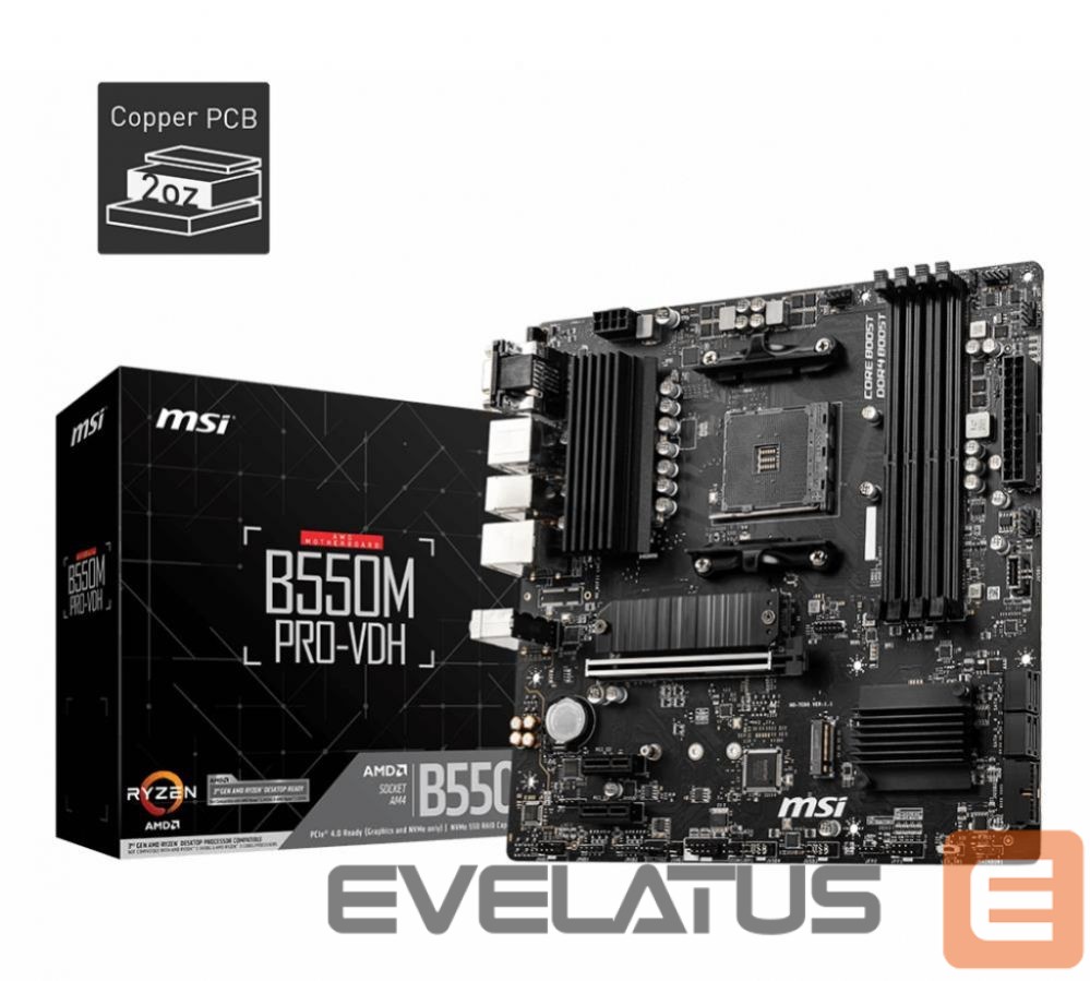 AMD protsessori emaplaat MSI Mainboard||AMD B550|SAM4|MicroATX|Memory DDR4|Memory slots 4|2xPCI-Express 3.0 1x|1xPCI-Express 4.0 16x|2xM.2|1x15pin D-sub|1xHDMI|1xDisplayPort|2xAudio-In|1xAudio-Out|2xUSB 2.0|4xUSB 3.2|1xPS/2|1xRJ45|B550MPRO-VDH