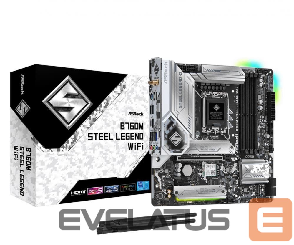 Intel protsessori emaplaat Asrock Mainboard||Intel B760 Express|LGA1700|Micro-ATX|Memory DDR5|Memory slots 4|1xPCI-Express 4.0 1x|1xPCI-Express 5.0 16x|4xM.2|1xHDMI|1xDisplayPort|2xUSB 2.0|5xUSB 3.2|1xUSB-C|1xPS/2|1xRJ45|3xAudio port|B760MSTEELLEGENDWIFI