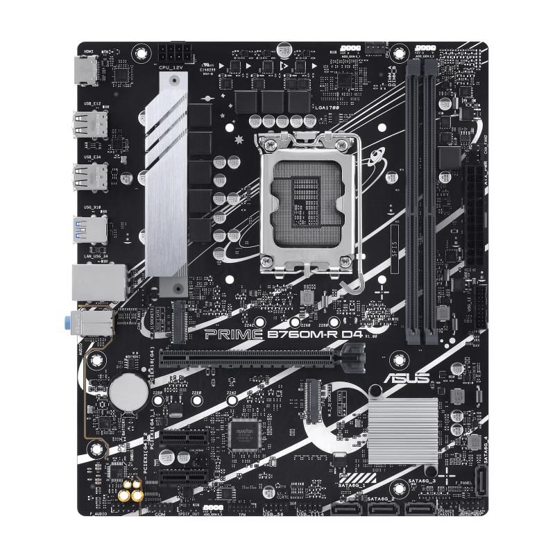 Intel protsessori emaplaat Asus Mainboard||Intel B760 Express|LGA1700|Micro-ATX|Memory DDR4|Memory slots 2|2xPCI-Express 4.0 1x|1xPCI-Express 4.0 16x|2xM.2|1x15pin D-sub|1xHDMI|4xUSB 2.0|4xUSB 3.2|1xOptical S/PDIF|3xAudio port|PRIMEB760M-RD4