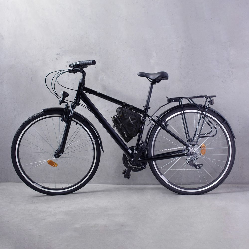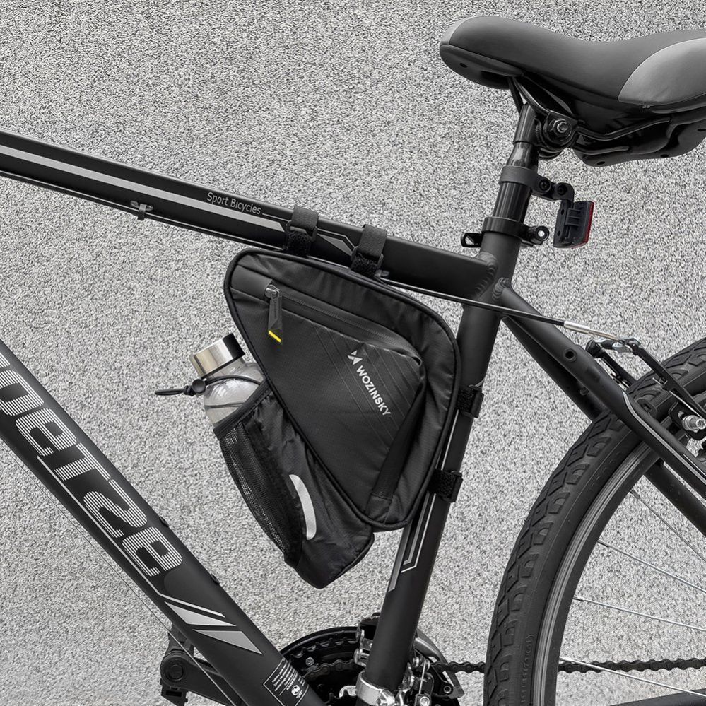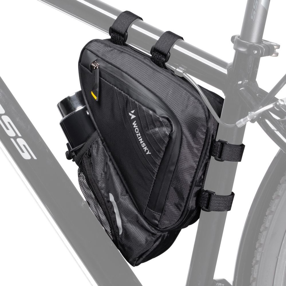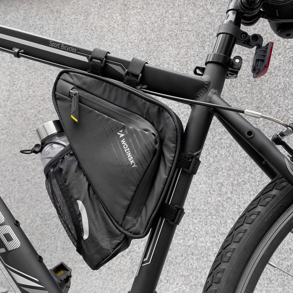 Wozinsky WBB23BK is a lightweight and compact frame bag . Its triangular shape fits perfectly into the arrangement of the frame . Importantly, it adapts so well to the shape of the frame that it does not interfere while driving – forget about unwanted knee strikes. Safety is also provided by the side opening . You don't have to take the bag off the frame to get something out of it.