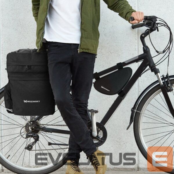 The Wozinsky WBB11BK frame bag is a triangular bag that attaches to the front of the frame using Velcro straps . It features a classic design – a single-compartment pannier with a zipper closure. Its triangular shape perfectly complements the bike's design .