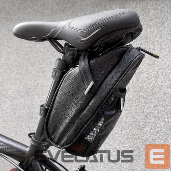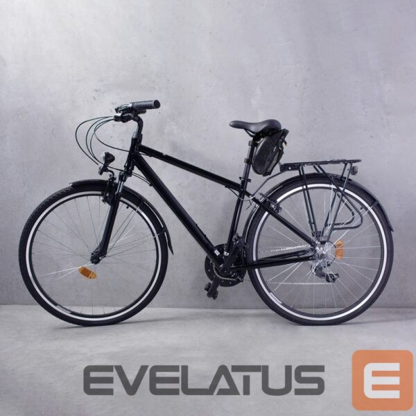 This bag fits perfectly under the bike seat , secured with three Velcro straps . The sturdy attachment ensures that even when riding fast or over bumps, the bag will stay in place, and its contents will be optimally protected from damage, loss, or dirt . Its modern design makes it suitable for all modern city, mountain, and road bikes . It also ensures good visibility regardless of weather conditions. It also has a designated space for a rear bike light .