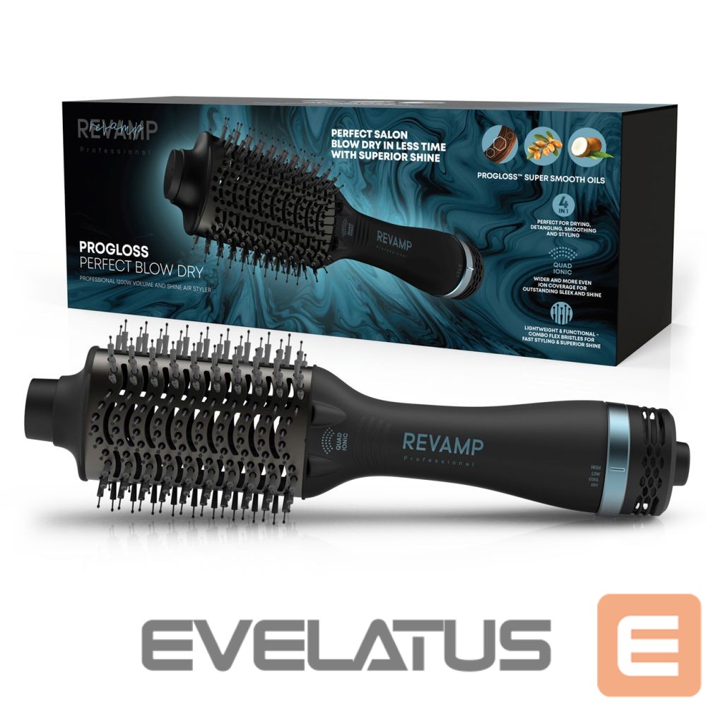 Võimas kuivatamine ja kujundamine on ühendatud üheks lihtsaks juuksetööriistaks. Revamp Progloss Perfect Blow Dry Volume and Shine Air Styler kuivatab, harutab, silub ja kujundab teie juukseid vaid ühe liigutusega. Harja ovaalne keraamiline silinder silub ja kujundab juukseid, samas kui ümarad servad lisavad juurtele volüümi, et aidata teil luua kodus salongikvaliteediga fööni. Kortsudeta kujundamise tagamiseks on sellel multifunktsionaalsel kujundajal 4 ioonjoa emitterit ja keraamiline tünn. Kohandage oma stiilikogemust kolme kuumuse/kiiruse seadistusega, sealhulgas valikuga Cool, millega saate oma soengud paika panna. Kerge disain ja 3-meetrine salongi pöörlev kaabel võimaldavad kiiret ja lihtsat stiilimist ning täiendavat paindlikkust. Sisaldatud Proglossi ülisiledate õlidega, et suurendada sära.