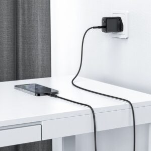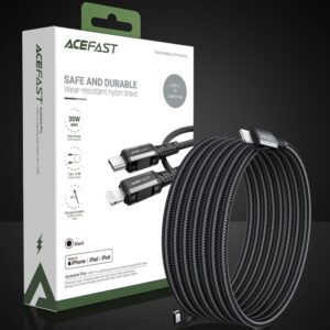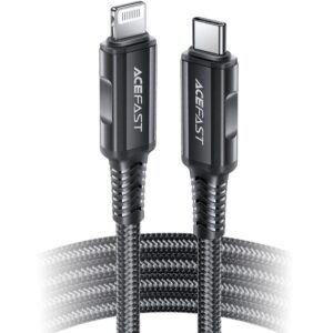 Acefast USB Type C – Lightning cable for charging and data transfer. It is intended for Apple devices with a Lightning connector. It is 180 cm long and designed to operate with a current of 30W and 3A. It is compatible with Power Delivery fast charging. It is MFI (Maide For iPhone) certified, so the phone will not display a message about a non-original accessory. The entire length of the cable is braided with nylon. The plugs have an aluminum housing. The cable ends have covers to prevent damage in places where they are most frequently bent.