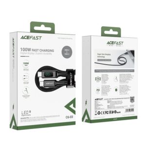 USB Type C – USB Type C cable for charging and data transfer by Acefast. It is intended for devices with a USB Type C connector. It is 200 cm long and can operate with a current of 100W and 5A. Enables fast charging using Power Delivery technology. It can be used to power notebooks with a USB Type C connector that need up to 100W of power (check the specifications of your laptop). The entire length of the cable is braided with nylon. It has a built-in screen that displays the current power value with which the device is being charged while charging. The plugs have an aluminum housing. The cable ends have covers to prevent damage in places where they are most frequently bent.