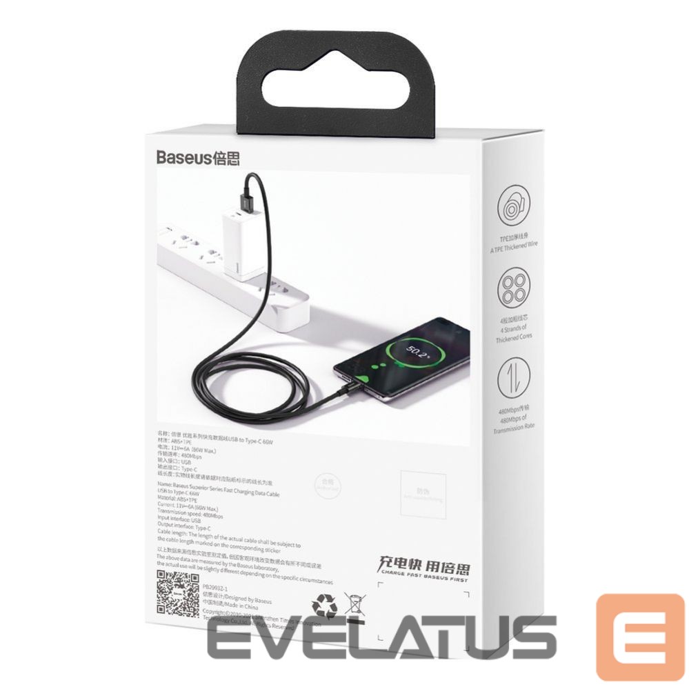 Quick charging and data transmission are possible thanks to cable USB-USB Type C 66 W. You can achieve perfect working parameters thanks to Baseus product which guarantees transmission speed of 480 Mbps. A 1-meter-long cable allows easy connection to power source and use of mobile phone while charging – no unexpected discharge risk.