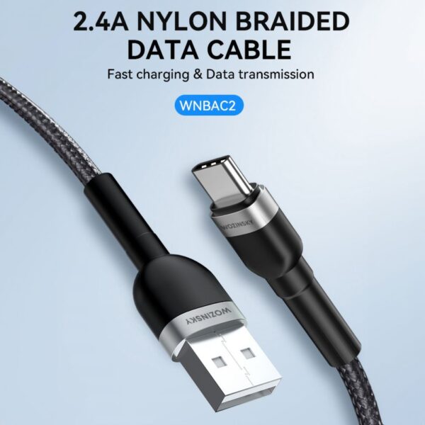 The USB-C and USB-A connectors in the Wozinsky WNBAC2 cable are designed to withstand up to 7 kg of mechanical load. This makes them extremely resistant to damage typical of everyday use, such as cracks or bending. This design ensures that the cable does not accidentally disconnect while charging.