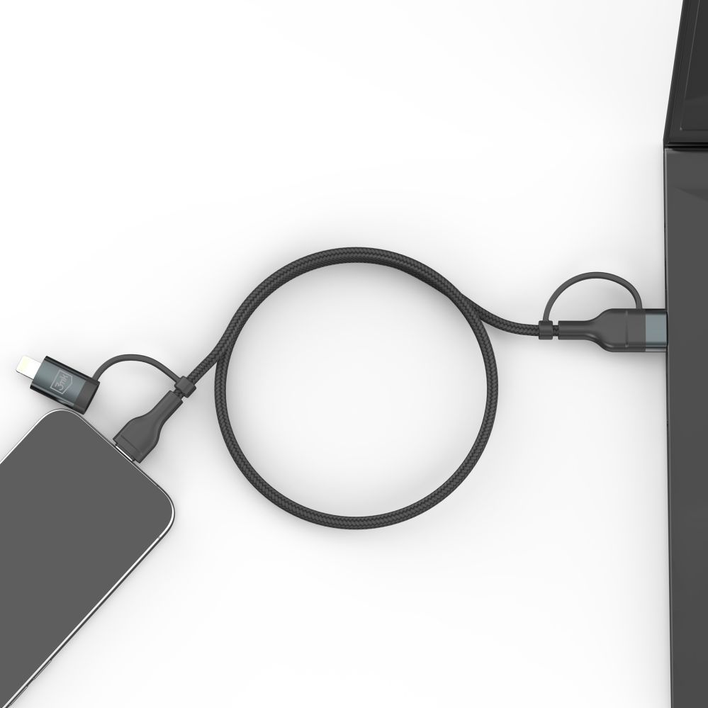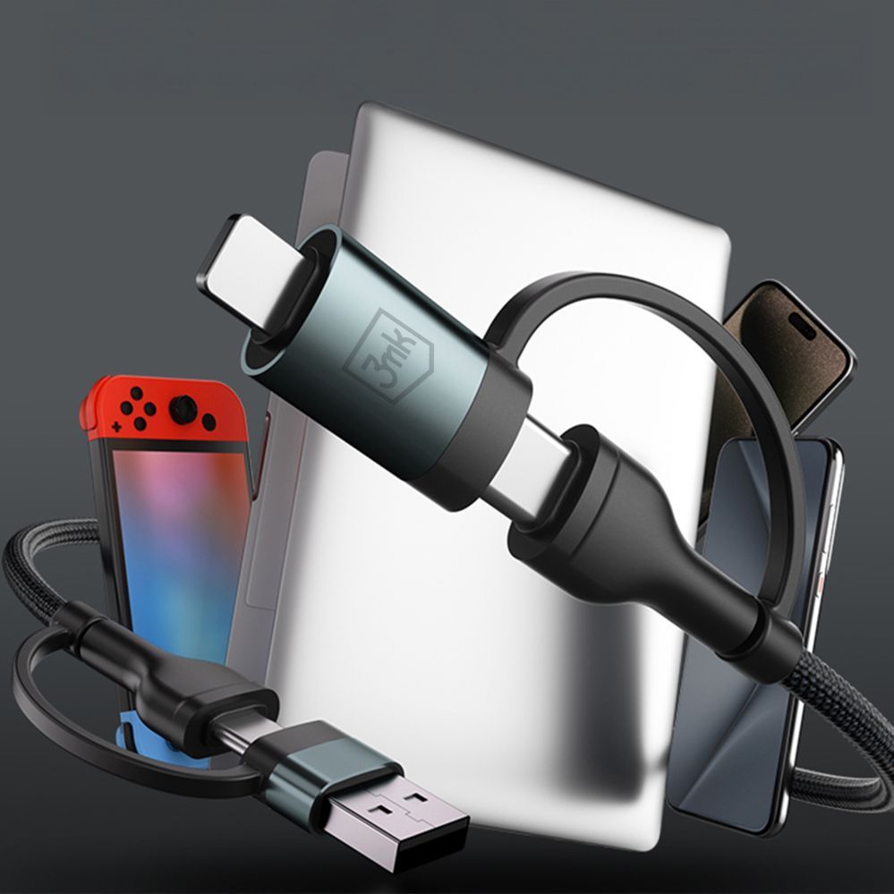 Four ports, complete freedom – this versatile cable eliminates the need to carry multiple cables by offering four ports in one: USB-C, Lightning , and USB-A. Connect your laptop via USB-C, charge your iPhone with Fast Charge up to 27W via Lightning, power your tablet via USB-C, or use USB-A for other devices. Intuitive port switching and a stable connection ensure reliable performance in any environment.