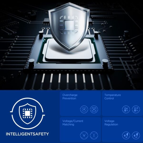 Quantum Boost technology automatically adjusts charging power to match connected devices, maximizing their efficiency. Built-in Overcharge Prevention, Voltage Matching, and Voltage Regulation features protect devices against overcharging, excessive voltage, and unstable current, ensuring safe and stable charging in all conditions.
