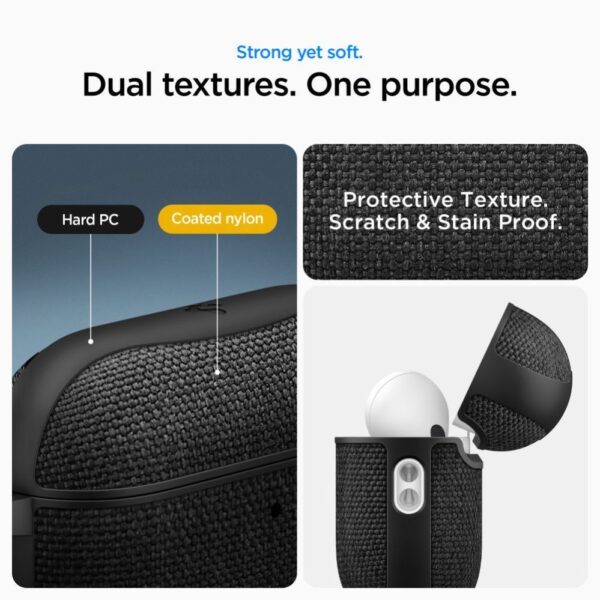 The elegant Urban Fit case for Apple AirPods Pro from Spigen. Crafted from a durable combination of polycarbonate (PC) and nylon, the case provides excellent protection against damage and comfort for everyday use. Precisely cut openings allow for hassle-free charging, and full wireless charging compatibility guarantees maximum functionality.
