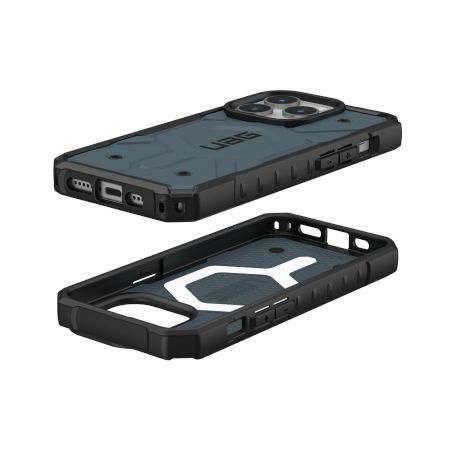 UAG Pathfinder ARMOR PROTECTION FOR YOUR IPHONE DURABLE CONSTRUCTION The UAG Pathfinder structure is composed of 2 layers which, when combined, create a synergistic shock absorption mechanism. This means that when the phone in the Pathfinder case hits a hard surface, the entire impact force is distributed on the surface of the case, and the device itself remains intact. Protection against falls from a height of 4.8 meters NO SCRATCHES Place and move the phone on a desk, table or other flat surface without any worries. Thanks to the raised rubber edges around the screen and camera, Pathfinder protects them against scratches. PRACTICAL DESIGN Pathfinder is one of the most characteristic series of the UAG brand. Characteristic rubber reinforcements on the edges of the case create strong accents that make the case stand out from the competition, and most importantly – they protect the phone's most vulnerable parts. Compatibility with MAGSAFE wireless charging Thanks to the magnetic module built into the case, Monarch is compatible with Apple Pay payments and MagSafe functionality. MagSafe ensures your phone is accurately positioned at the charging point on the wireless charger. All you have to do is place your phone against the charger matrix, and both devices will attract and adjust perfectly to each other, ensuring stable charging. COMFORT AND CONFIDENCE Special protrusions on the edges of the case minimize slippage so that the phone holds securely in your hand. Therefore, the phone in the Pathfinder housing guarantees a secure grip even when wearing gloves or in difficult conditions. PORTS AND BUTTONS The buttons and mute switch on the phone are protected against dust by precisely designed, movable housing elements that ensure comfortable use of the phone's functions. Integrated lanyard anchor (lanyard not included) CERTIFIED PROTECTION Compliance with the MIL STD 810G 516.6 military standard, which determines the degree of shock resistance in the event of a fall.