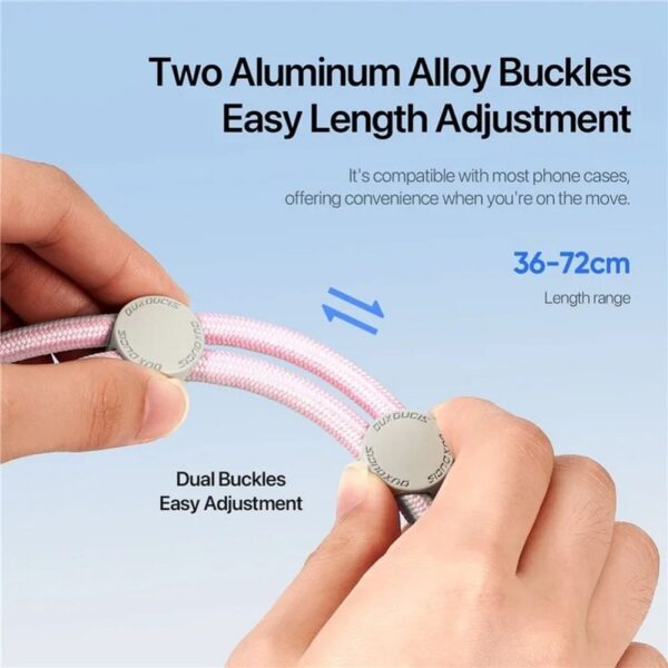 The DUX DUCIS Plaz lanyard offers easy length adjustment from 36 to 72 cm, making it suitable for people of different heights and wearing style preferences. This makes the lanyard extremely versatile, providing comfort in everyday use, both during walks and physical activities. Two buckles made of aluminum alloy guarantee solid hold and safety of the phone.