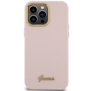 Tagakaaned Guess Guess Silicone Script Metal Logo & Frame case for iPhone 15 Pro – pink