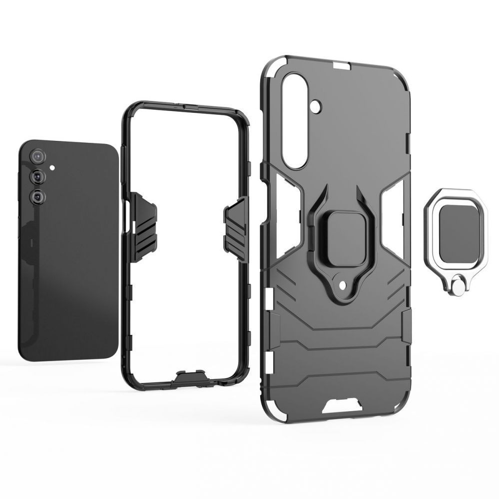 The Ring Armor series case is made of a thermoplastic and durable material that imitates metal. The cover is adapted to the Samsung Galaxy A24 4G , perfectly protects the phone against damage due to falls or scratches (for example, by keys carried in a pocket). Raised edges around the screen and rear camera protect the phone from scratching these elements when it is placed on a flat surface. It has responsive buttons and cutouts for ports. Perfect for people who value style, quality and want to take care of their device. It has a built-in metal ring that allows you to conveniently use the phone with one hand and also functions as a stand.