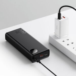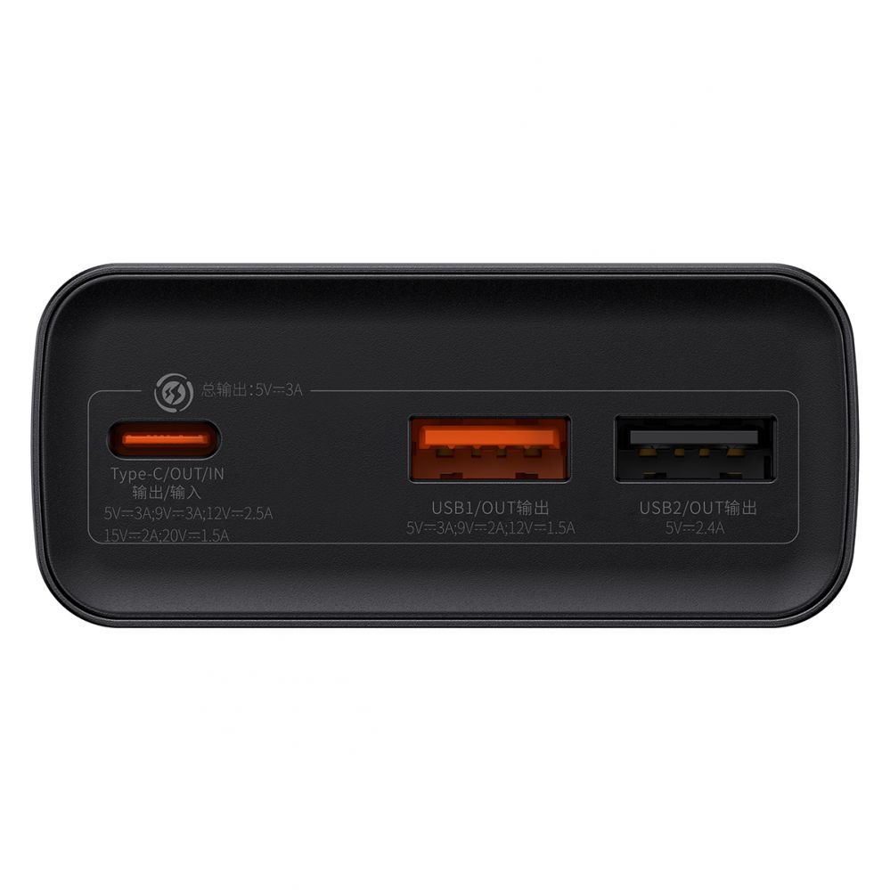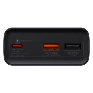 Baseus20000 mAh power bank. Supports output current with a maximum power of 30W . It supports many standards of fast charging , e.g. Quick Charge 3.0, Power Delivery 3.0. It has built-in 2 USB output ports and a USB Type C input/output port (for charging phones and the powerbank itself). The LED screen, which is located on its housing, indicates the current value with which it is currently operating and the battery charge level. The IC supports multiple protections that protect connected devices from damage.