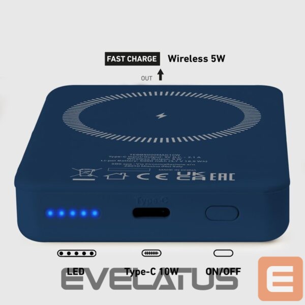 The TEBB5000MAG1CB power bank supports iPhones with MagSafe technology and Android smartphones with wireless charging. The magnetic mount ensures a secure and comfortable fit to the device.