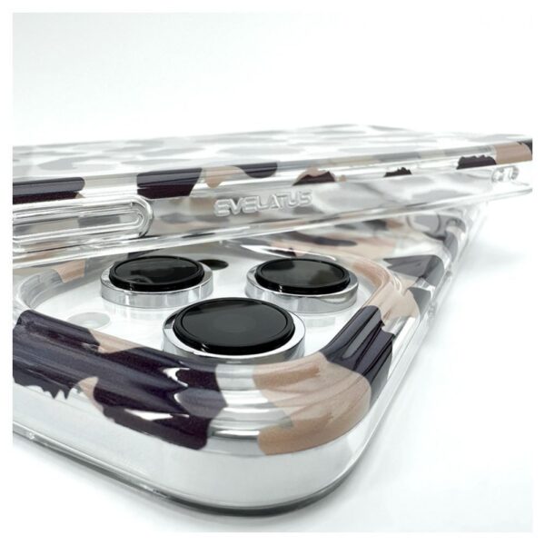 This Evelatus case is engineered using a dual-material approach to maximize both aesthetics and function. The back is crafted from durable Polycarbonate, which serves as an excellent canvas for high-quality prints while offering rigid protection. The perimeter consists of a soft, shock-absorbing material that ensures a seamless fit and effortless installation. The raised camera housing is integrated smoothly into the design, offering essential protection for your optics. The ergonomic soft-touch sides ensure the phone sits comfortably in your hand for daily usage.