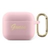 Guess Silicone Cover. The silicone case protects the Apple AirPods wireless headphones dock from surface damage and possible loss. The high-quality silicone case fits perfectly with the original AirPods 3 case and is extremely pleasant to the touch. The whole thing is complemented by the distinctive gold Guess logo that makes the case look elegant. On the side of the case there is a practical golden ring that allows you to attach the case to a leash, for example.
