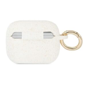 Guess Silicone Cover. The silicone case protects the Apple AirPods Pro wireless headphone dock from surface damage and scratches. The high-quality silicone case fits perfectly with the original AirPods Pro case and is extremely pleasant to the touch. On the side of the case there is a practical golden ring that allows you to attach the case to a leash, for example. Additional visual effects are added by a glitter finish.