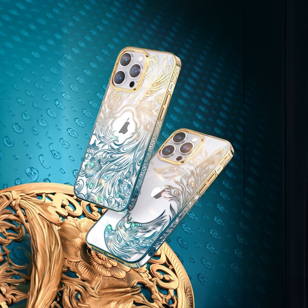 Luxury iPhone 14 Pro case with real crystals from the Kingxbar Phoenix series in gold and blue