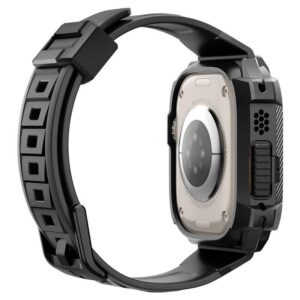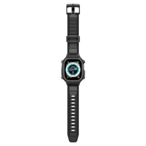 A comfortable, sporty strap Spigen Rugged Armor Pro made of flexible TPU material decorated with carbon fiber accents. It has an integrated housing with raised edges that protect the watch case from scratches and impacts. The strap is fully functional and can be adjusted according to individual needs.