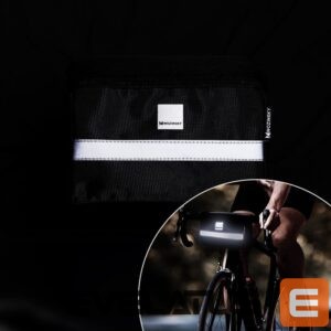 The front part of the handlebar bag has a sewn-in reflective strip . Thanks to it , you will feel really safe while driving at night . In addition, the logo placed on the front has also been covered with reflective paint.