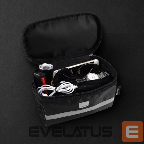 The Wozinsky WBB12BK handlebar bag offers plenty of storage space . It has a 2-liter main compartment and two additional outer mesh pockets . You can easily fit a power bank, sunglasses, headphones, gloves, a flashlight, keys, a wallet, and, of course, your phone .