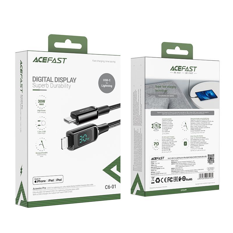 Acefast USB Type C – Lightning cable for charging and data transfer. It is designed for Apple devices with a Lightning connector. It is 120 cm long and is designed to work with a current of 30W and 3A. It is compatible with Power Delivery fast charging. It has an MFI (Maide For iPhone) certificate, so the phone will not display a message about a non-genuine accessory. It has a built-in screen on which the current value of the power with which the device is being charged is displayed during charging. The cable is braided along its entire length with nylon. The plugs have an aluminum housing. The cable ends are protected against damage at the most frequent bending points.