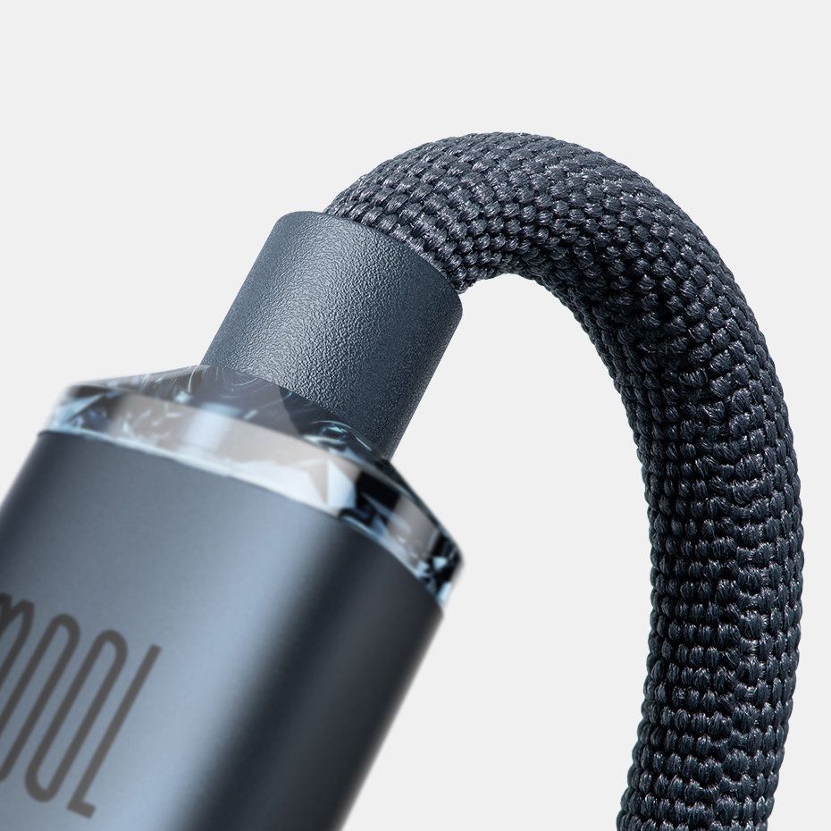 The Baseus Crystal Shine Series braided USB Type C to USB Type C cable cover with a durable texture has additional reinforcement where the plug connects to the cable. Therefore, it is resistant to bending and tension. Inside there is an 8-wire copper cable that, thanks to an intelligent chip, does not heat up even during simultaneous charging and data transfer.