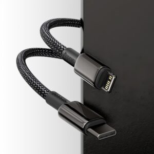 Very durable USB Type C – Lightning cable with a nylon braid. It is made of a material that is exceptionally durable and wear-resistant. The plugs are terminated with reinforced zinc alloy housings and rubber caps to minimize the risk of cable breaks in these places. It is perfect for transferring data and charging your phone. It can withstand a load of up to 20 W and is suitable for fast Power Delivery charging of the latest iPhones.