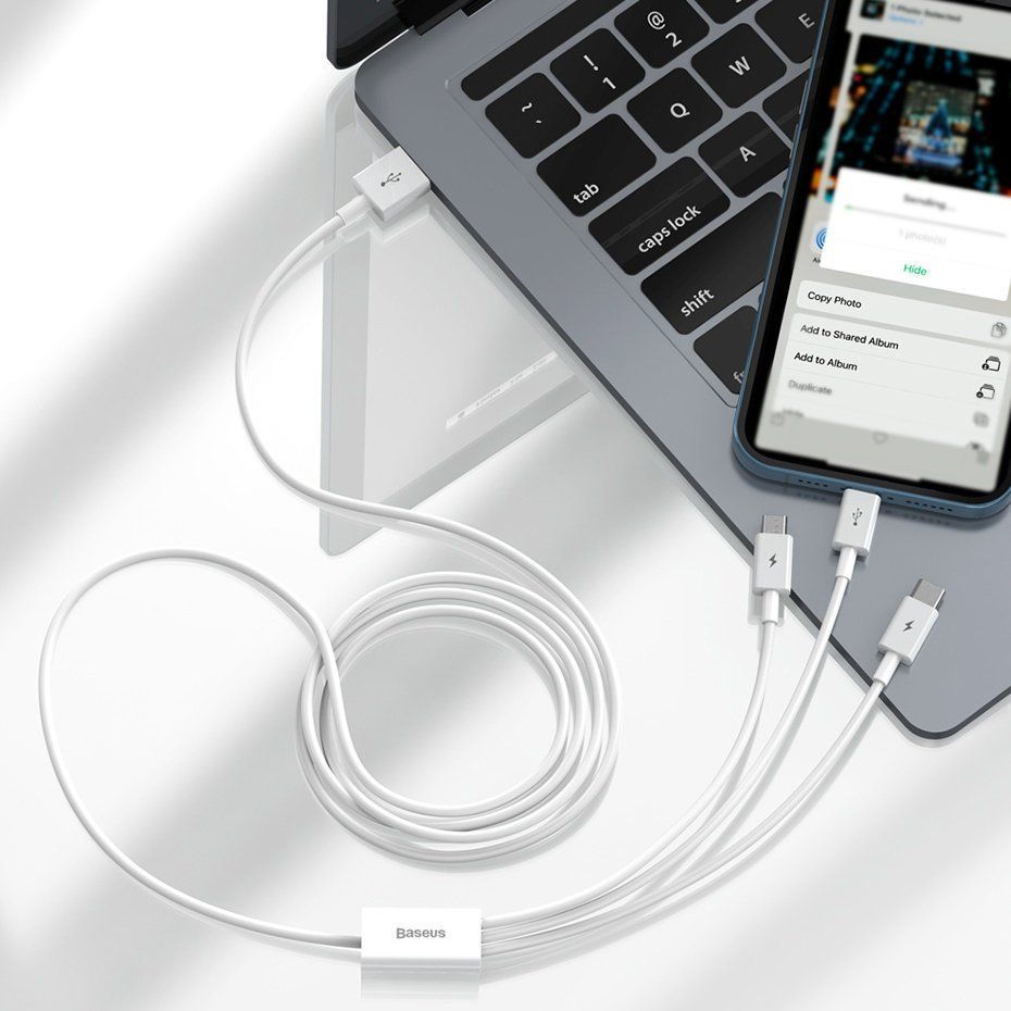 USB cable with 3 plugs: USB Type C, micro USB and Lightning. A single cable that allows you to charge any device equipped with the aforementioned connectors and transfer data, eg to and from a computer to a phone. Ideal for people with several devices from different manufacturers.