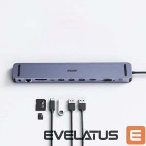 - Output: HDMI (4K UHD @ 60Hz), VGA (1920x1080p @ 60Hz), Ethernet RJ-45 (max. 1Gbps), 3.5mm mini jack, SD card, Micro SD card, USB Type C, USB Type C 100W PD 3 x USB 3.0