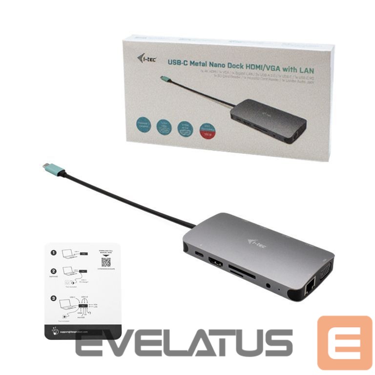 I-TEC USB-C Metal Dock 1xHDMI 1xVGA 1xSD+1xmicroSD Card reader 1xGLAN 1xAudio/Mic 3xUSB 3.1 1xUSB-C Data 1xUSB-C PD + Charger 100W