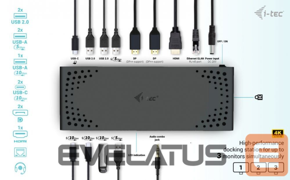 I-TEC USB-C Triple Display DS Gen2 2xDP 1xHDMI 1xGLAN 1xUSB 3.2 Gen2 2xUSB 3.2 Gen1 2xUSB-C Gen2 2xUSB 2.0 1xAudio/Mic PD100W
