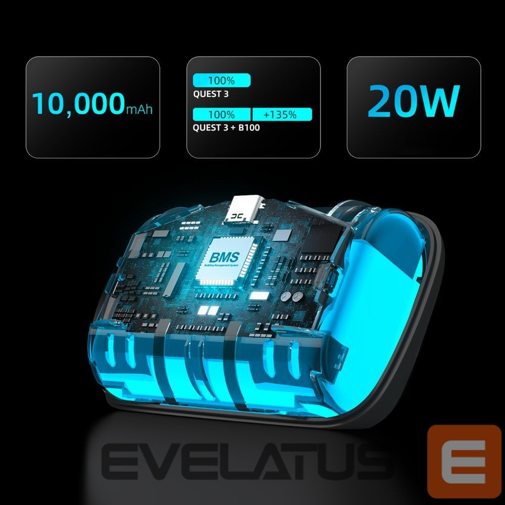 - Provides longer working time and fast charging . The compatible B100 battery with a capacity of 10,000 mAh offers additional working time for Meta Quest 3 and charging power of up to 20W.