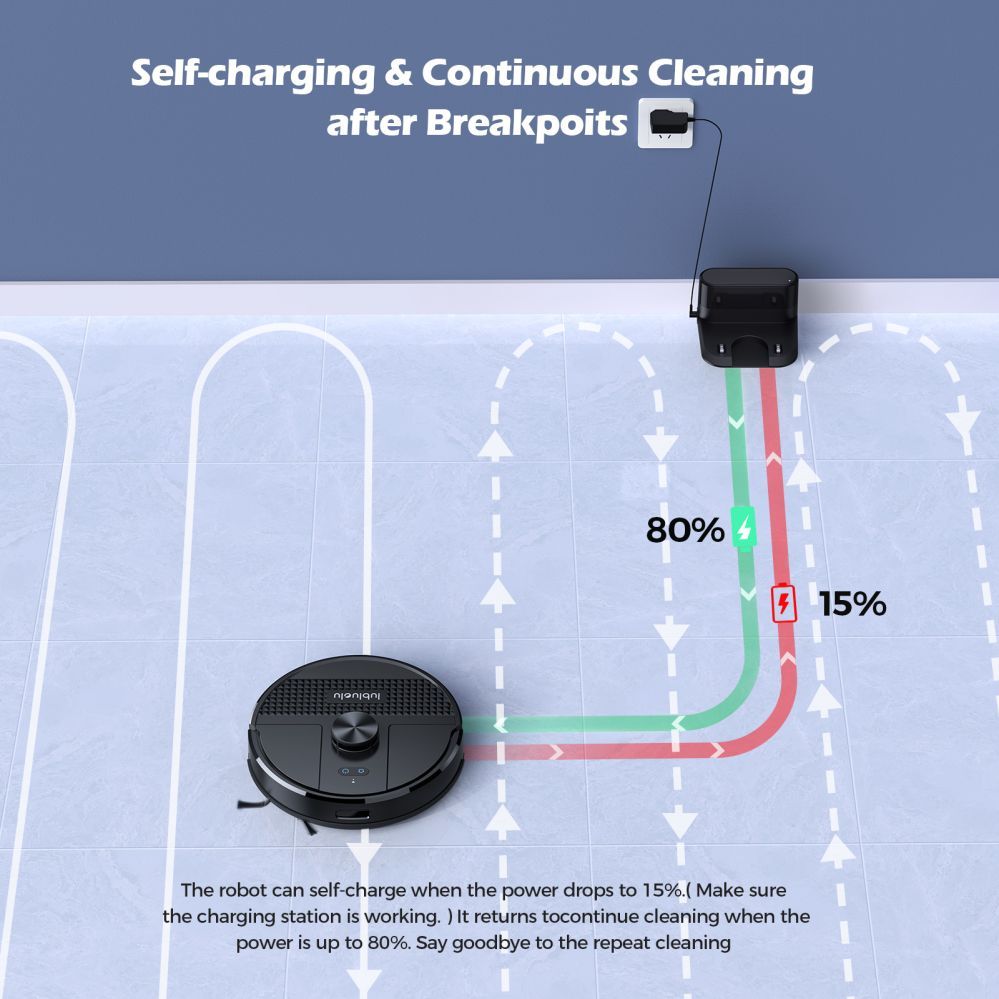 - Auto-Recharge & Resume: Automatically returns to the charging station when the battery is low and resumes cleaning from where it left off after recharging.