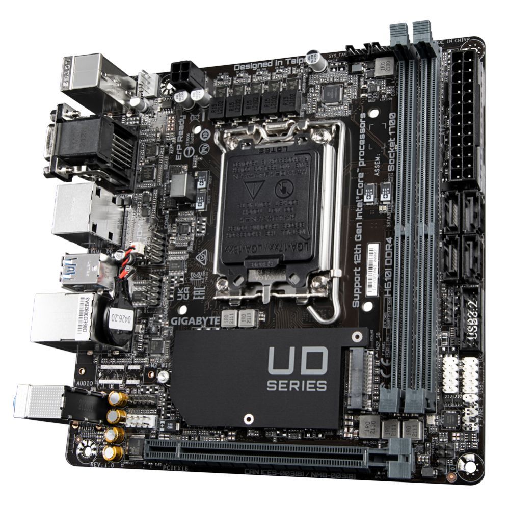 Intel procesoriaus pagrindinė plokštė Gigabyte H610I DDR4 1.0 M/B Processor family Intel, Processor socket LGA1700, DDR4 DIMM, Memory slots 2, Supported hard disk drive interfaces SATA, M.2, Number of SATA connectors 4, Chipset Intel H610 Express, Mini-ITX