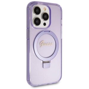 Nugarėlės dėklai Guess Guess Ring Stand Script Glitter MagSafe case for iPhone 14 Pro Max – purple
