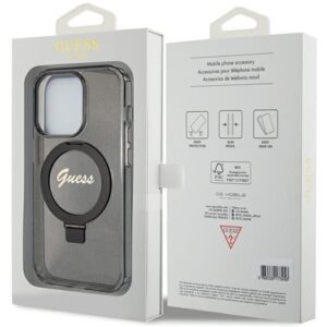 Nugarėlės dėklai Guess Guess Ring Stand Script Glitter MagSafe case for iPhone 15 Pro Max – black