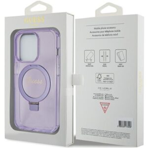 Nugarėlės dėklai Guess Guess Ring Stand Script Glitter MagSafe case for iPhone 15 Pro – purple