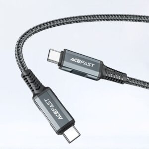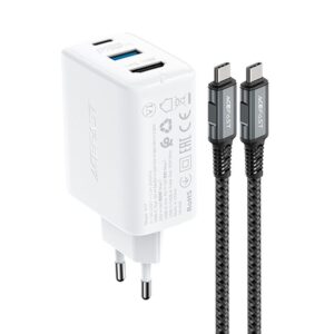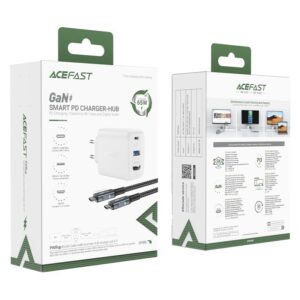 Acefast 2-in-1 fast charger. It has a USB Type C port that allows charging with a maximum power of 60W and a USB 5W port. The UBS Type C plug can be used to power notebooks that require up to 60W of power to work (check the specification of your computer). It allows you to quickly charge two devices at the same time, incl. in PPS, Power Delivery, Quick Charge 3.0, AFC and FCP standards. It is made of fireproof PC material. It has been equipped with many protections, such as overheating, overvoltage, high voltage or overload. The set includes a USB Type C – USB Type C cable with a length of 1.8m. The electronic components of the charger are made in GaN technology, i.e. they are based on gallium nitride, not on silicon. GaN means better work efficiency and lower energy consumption.
